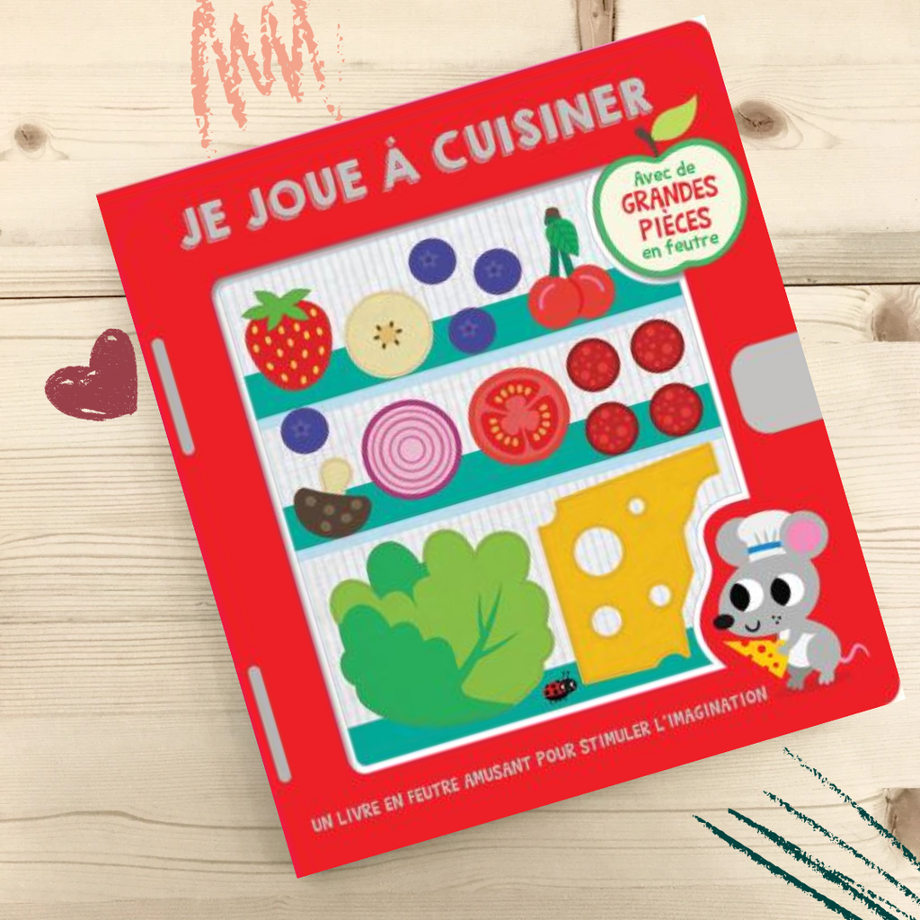 Je joue à cuisiner est un livre interactif tout carton accompagné de grandes pièces en feutre à coller sur les pages duveteuses.